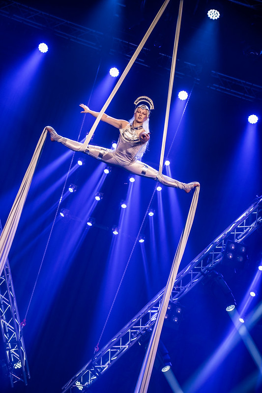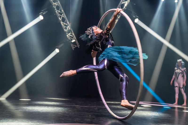 Keiloilla jonglöörataan suorastaan tanssillisesti. Oikeastaan tanssahtelu oli lisääntynyt muihinkin numeroihin sitten viimenäkemäni. Ja yksipyöräisiä sirkuspyöriä käytettiin muuhunkin kuin ajamiseen, pään päällä esimerkiksi.
